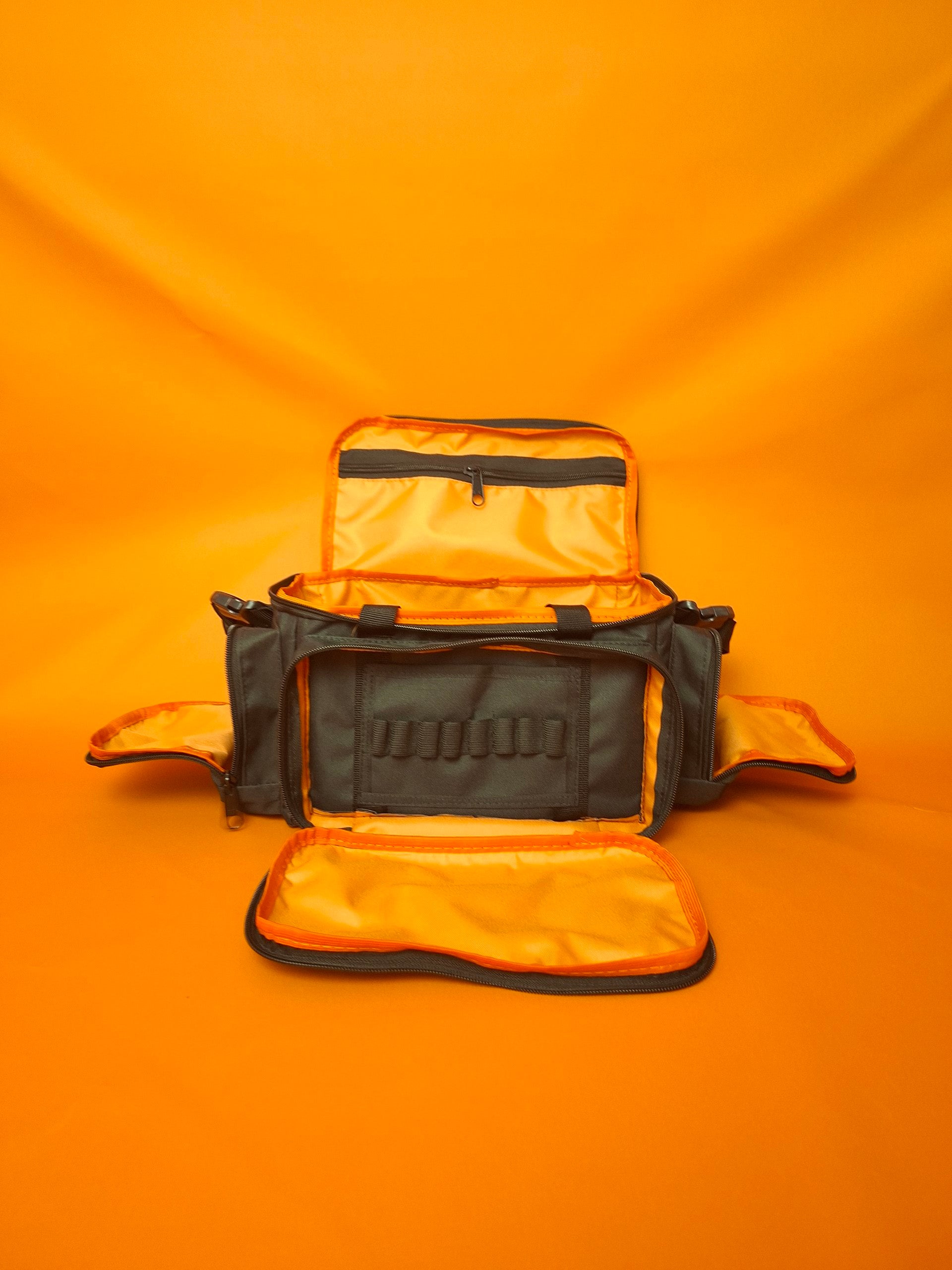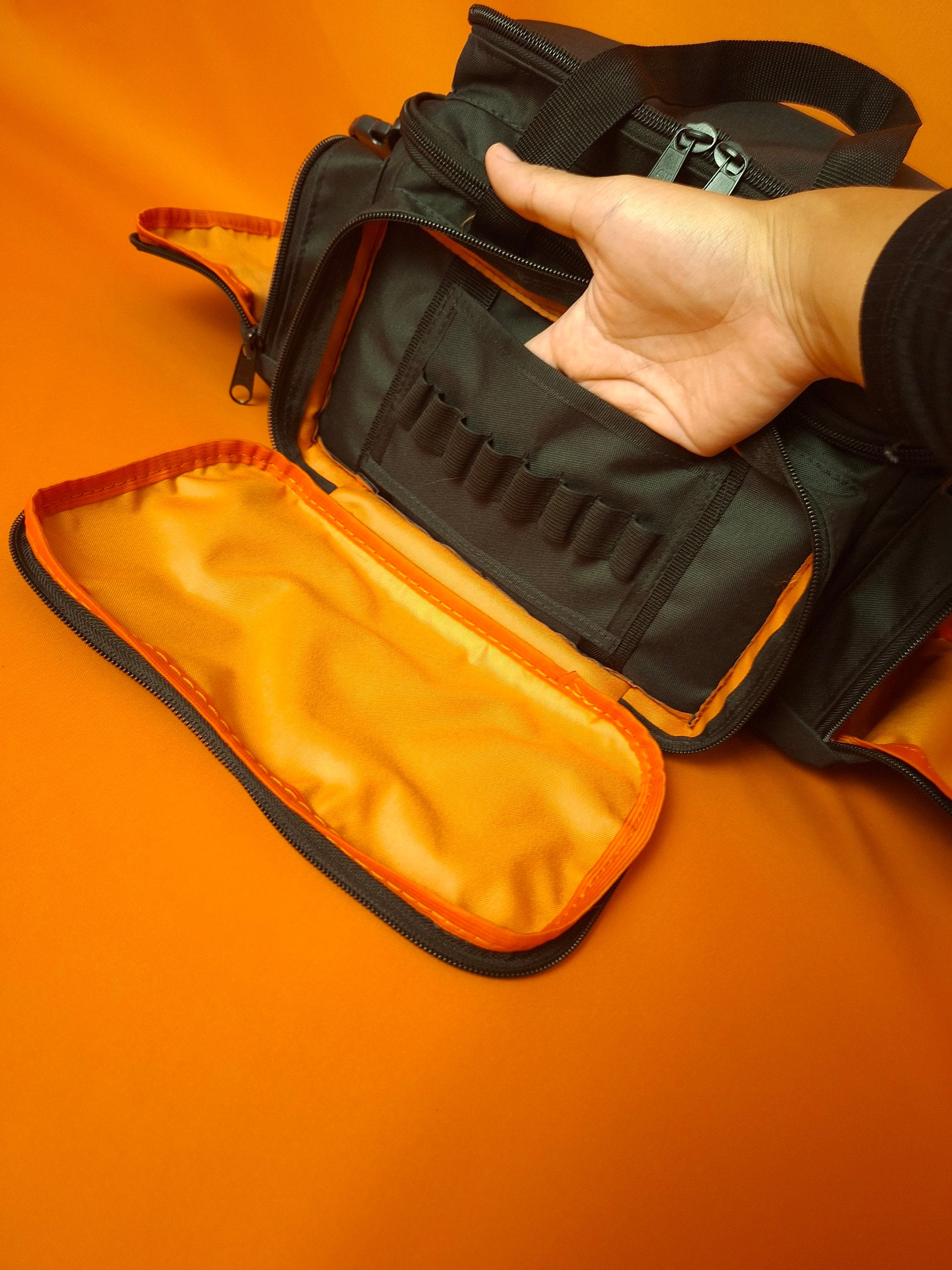 - 01 Bolso superior da tampa transparente com faixa refletiva. - - Forro interno na cor laranja (padrão)